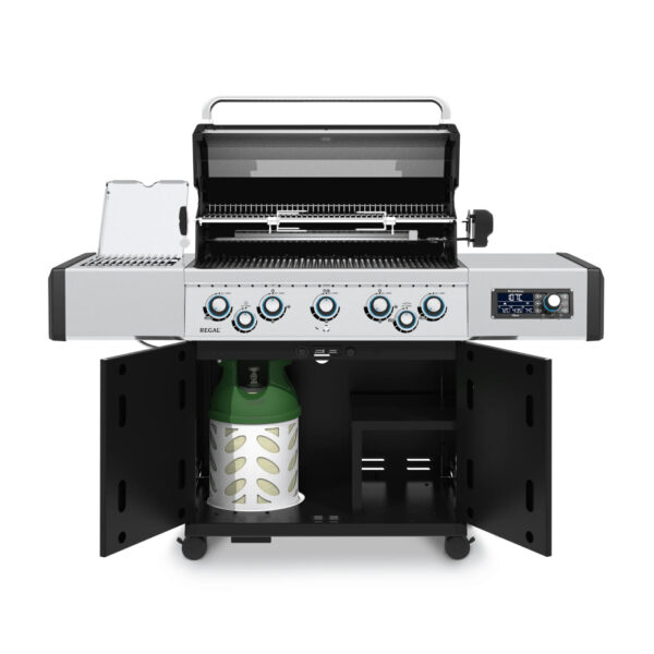 Broil King Regal Q 590 IR — это газовый гриль, который станет идеальным выбором для любителей кулинарии, стремящихся к высоким результатам и удобству в использовании. Гриль предлагает общую площадь для приготовления пищи 5645 см², включая решетку для подогрева. Он оснащен прочными чугунными решетками для приготовления пищи Flav-R-Cast с матовой эмалью, системой Flav-R-Wave, 5 горелками Dual-Tube, боковой горелкой, горелкой для вертела, комплектом для вертела, боковыми полками из нержавеющей стали, подсвечиваемыми ручками управления и полностью закрытым шкафом. Гриль оснащен цифровым контроллером для легкой регулировки температуры и имеет функцию удаленного управления.