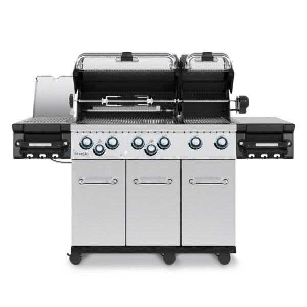 Broil King Regal S 690 Pro IR — это газовый гриль, который станет идеальным выбором для любителей кулинарии, стремящихся к высоким результатам и удобству в использовании. Гриль предлагает общую площадь для приготовления пищи 6645 см², включая решетку для подогрева. Он оснащен решетками из нержавеющей стали толщиной 9 мм, системой Flav-R-Wave, 6 горелками Dual-Tube, боковой горелкой, горелкой для вертела, комплектом для вертела, боковыми полками из нержавеющей стали, подсвечиваемыми ручками управления и полностью закрытым шкафом.